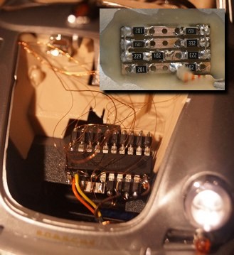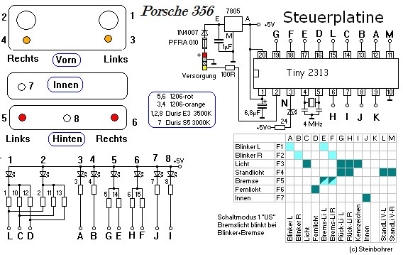 Unter der Haube läuft alles an Kupferdraht zusammen. Die Widerstände sind "unterwegs" eingebaut. Sicher kann man die Elektronik noch unter dem Reserverad verschwinden lassen. Vielleicht mache ich das auch noch (irgendwann...). Der Schaltplan ist nur der Vollständigkeit halber mal gezeigt. Die Steuerelektronik ist bei meinen Modellen weitgehend identisch und ermöglicht die individuelle Ansteuerung meiner Modelle ähnlich einer digitalen Modelleisenbahn.
