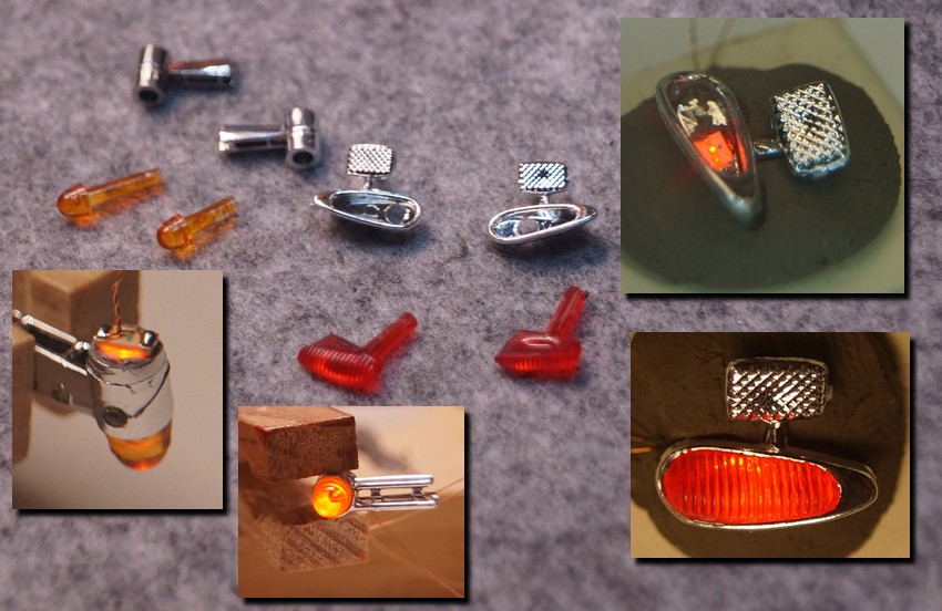 Blinker und Bremslicht sind die nächsten Baustellen. Es kommen Leuchtdioden in Rot und Orange der Bauform 1206 (1,6 x 3,2mm) zum Einsatz. Im Original sind im Rücklicht laut meinen Recherchen eine Lampe für das Rücklicht und eine Lampe für das kombinierte Brems- Blinklicht verbaut. Ob Rücklicht oder Bremse realisiere ich über unterschiedliche LED-Ströme und damit unterschiedliche Helligkeit der LED. Zum Verkleben der LEDs habe ich transparenten Nagellack verwendet.